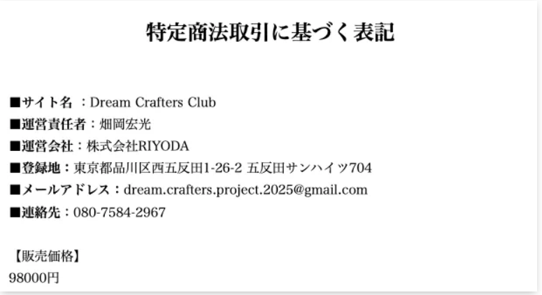 ドリームクラフターズの特商法表記には以下の不備があるんだ: