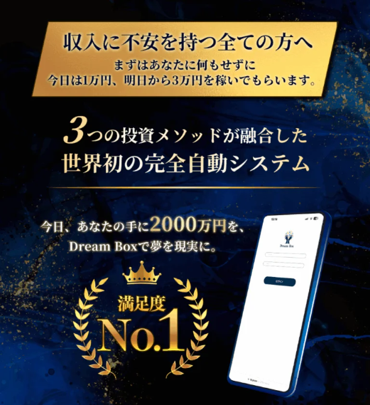 「1万円から2000万円」「完全放置で稼げるDream Box」「FX・暗号資産・日経225の三段階自動収益システム」って聞いて興味を持った人も多いんじゃないかな?