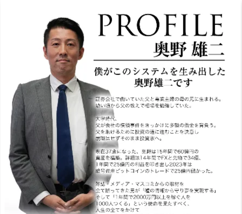 | 案内人 | 奥野雄二(60億円投資家) | 架空人物の可能性・証拠ゼロ |