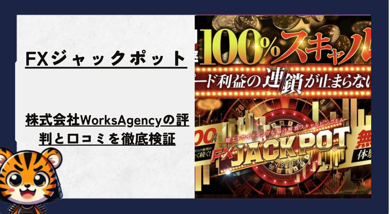 FXジャックポット(FX JACKPOT)は、石黒雄二が開発者として紹介され、株式会社WorksAgencyが販売する「AI自動売買システム(EA)」だよ。
