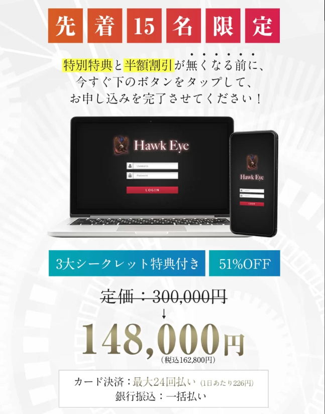 - 「今すぐLINEを追加して、ホークアイの最新情報と限定特典をお受け取りください」
