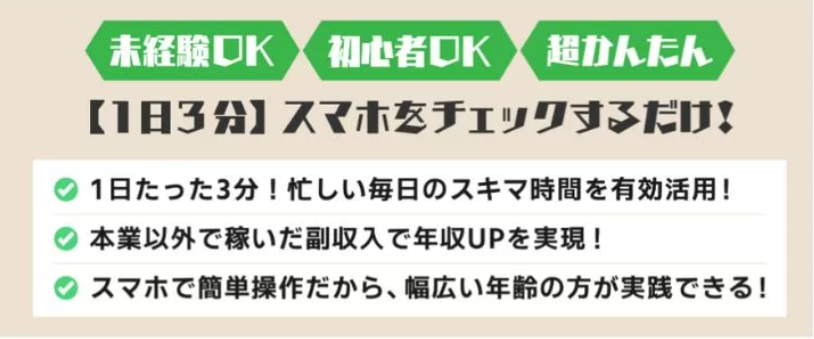 毎日1万円副収入GET!」「スマホ3分で完全放置」「初心者・未経験OK」って聞いて興味を持った人も多いんじゃないかな?