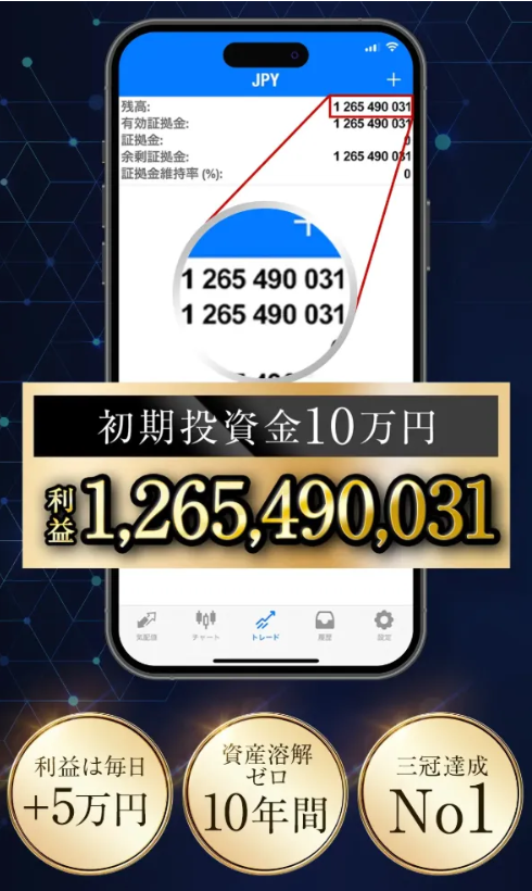 - 宣伝内容:10万円→12億円・毎日+5万円・10年間資産溶解ゼロ