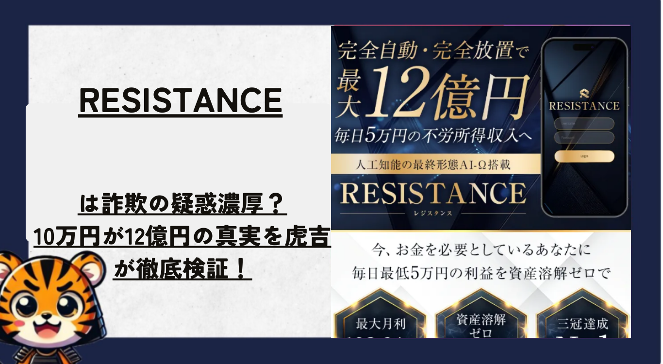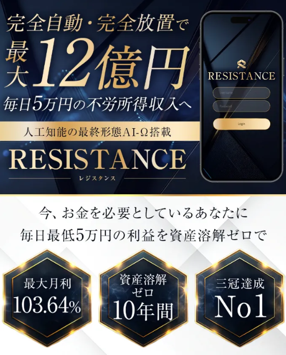 RESISTANCEが宣伝する「10万円が12億6549万31円・毎日+5万円・完全自動」について徹底調査したところ、AI投資詐欺であることを示す疑惑が次々と浮上したよ。