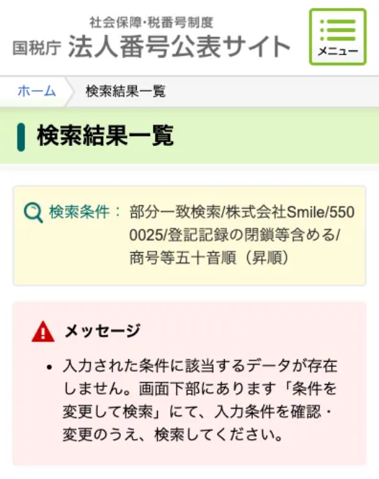 国税庁の法人番号検索で確認不可